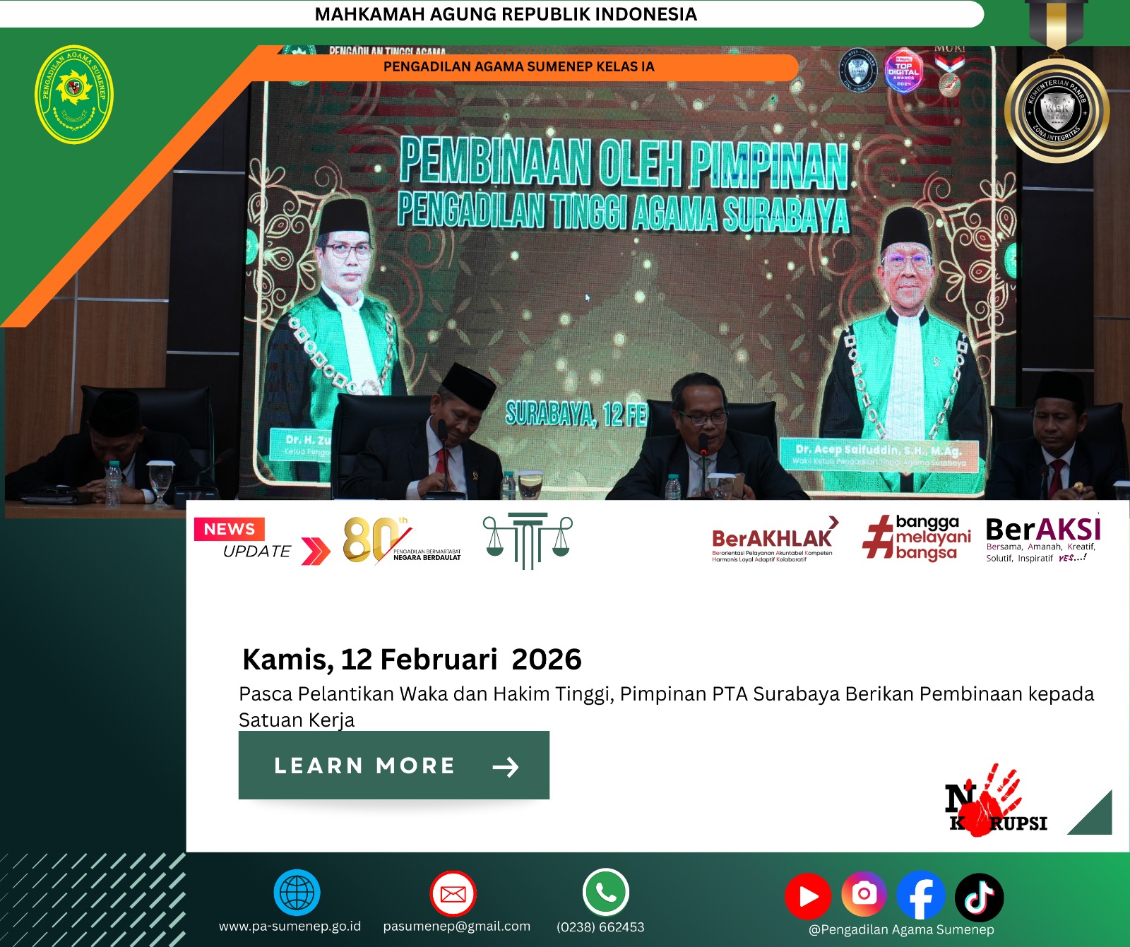 Baca Juga : Penuh Khidmat, Jajaran Pimpinan PA Sumenep Hadiri Pelantikan Wakil Ketua dan Hakim Tinggi PTA Surabaya
