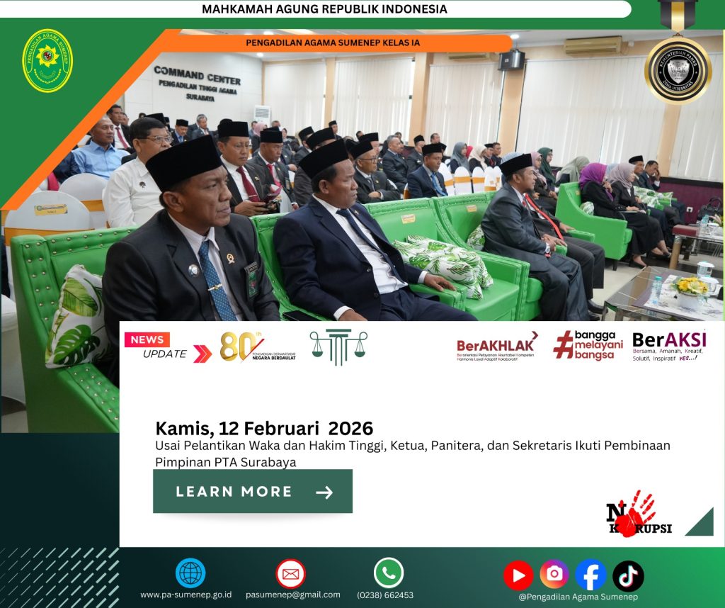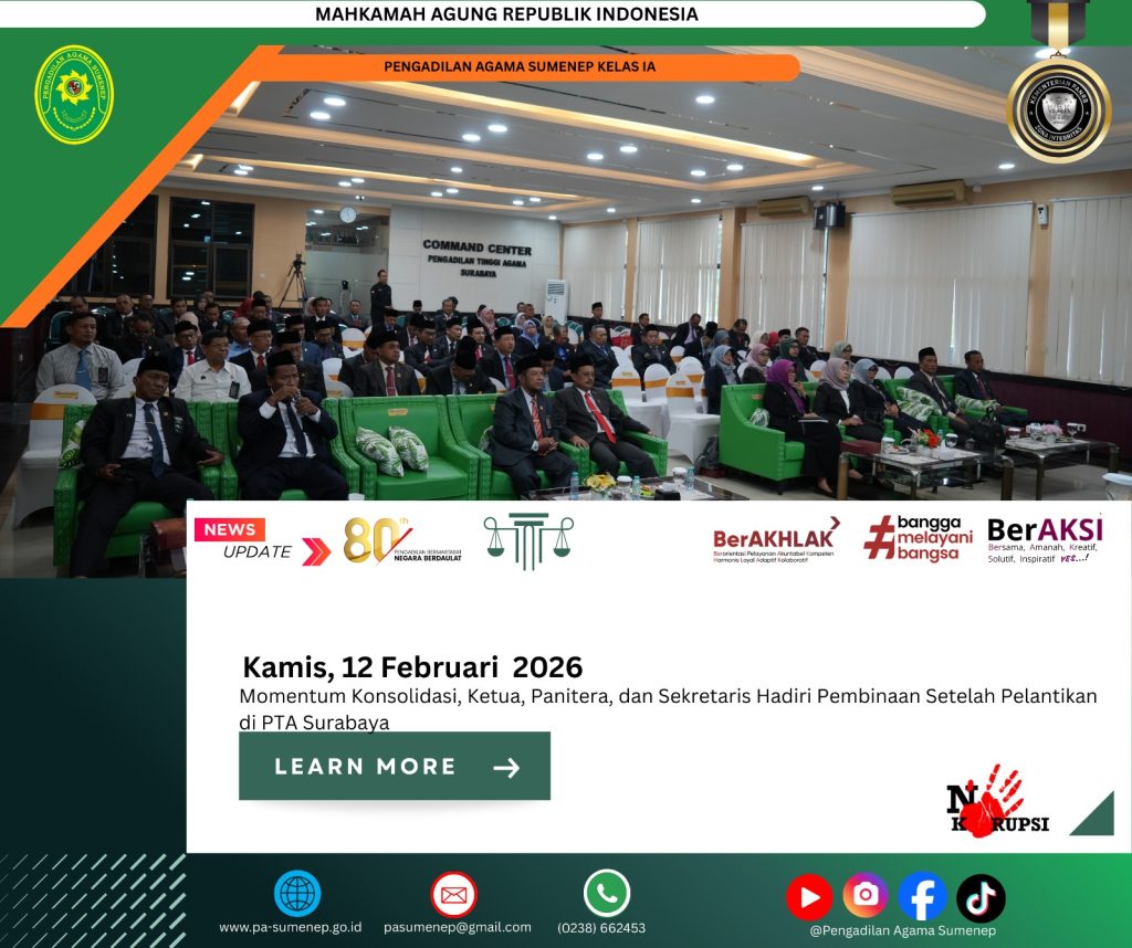 pa-sumenep.go.id – Usai pelantikan Wakil Ketua dan Hakim Tinggi PTA Surabaya, rangkaian kegiatan dilanjutkan dengan pembinaan bagi seluruh satuan kerja di wilayah hukum PTA Surabaya pada Kamis, 12 Februari 2026. Ketua, Panitera, dan Sekretaris Pengadilan Agama Sumenep turut mengikuti kegiatan tersebut dengan penuh perhatian dan semangat evaluatif. Momen ini menjadi ruang refleksi sekaligus penguatan komitmen dalam meningkatkan kualitas pelayanan peradilan agama.