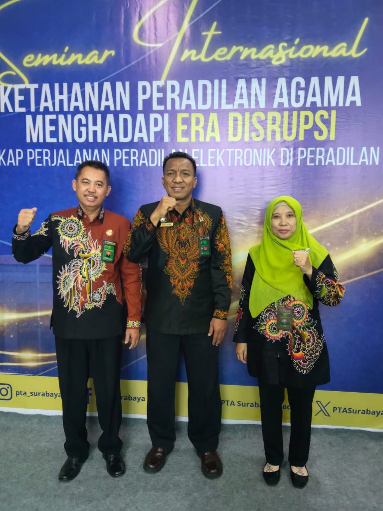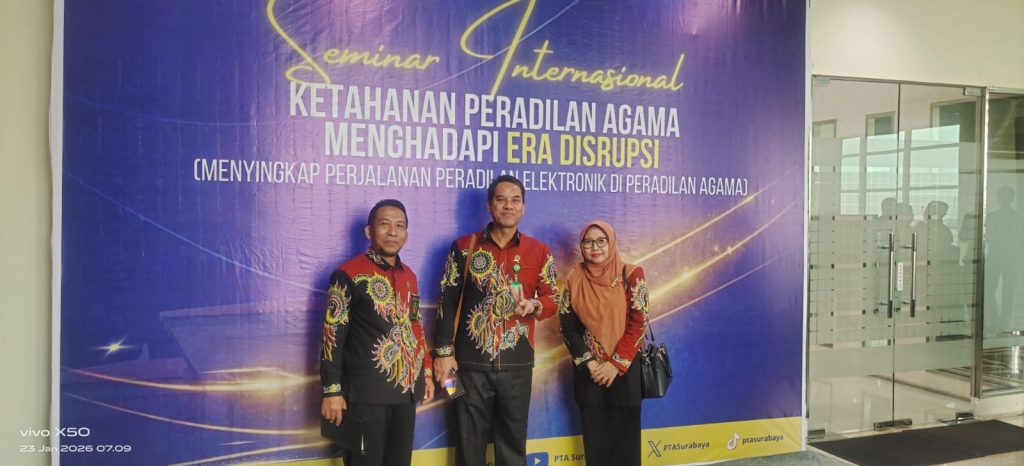 pa-sumenep.go.id – Pimpinan beserta Hakim PA Sumenep mengikuti kegiatan Seminar Internasional Ketahanan Peradilan Agama Menghadapi Era Disrupsi di PTA Surabaya. Kegiatan tersebut di laksanakan pada tanggal 23 januari 2026. Seminar ini diikuti oleh pimpinan peradilan agama dari berbagai daerah di Jawa Timur. Kegiatan ini menjadi momentum penting dalam memperkuat kesiapan lembaga peradilan agama menghadapi tantangan perubahan zaman yang kian cepat dan kompleks.