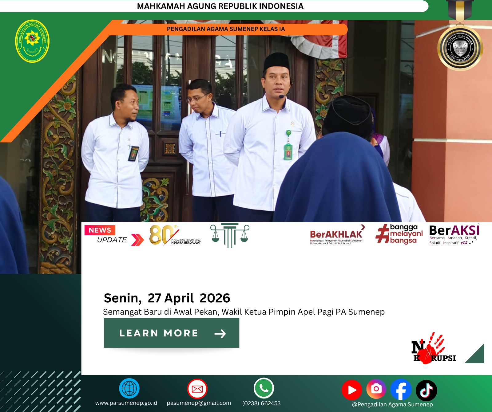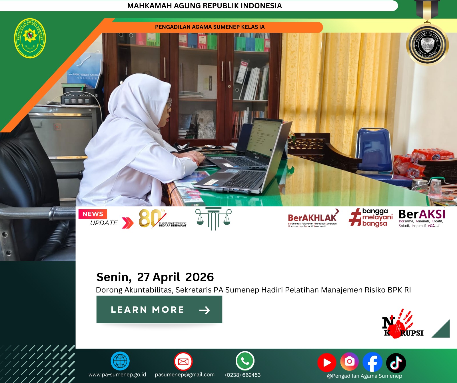 pa-sumenep.go.id – Sekretaris Pengadilan Agama Sumenep, Elly Kusdiana Hobaidah, S.Ag., mengikuti pelatihan Manajemen Risiko yang diselenggarakan oleh Badan Pendidikan dan Pelatihan Pemeriksa Keuangan Negara pada Senin, 27 April 2026. Kegiatan yang berlangsung hingga Kamis, 30 April 2026 ini dilaksanakan secara distance learning dan diikuti oleh seluruh sekretaris pengadilan se-Indonesia. Pelatihan ini bertujuan untuk meningkatkan pemahaman … Baca Selengkapnya
