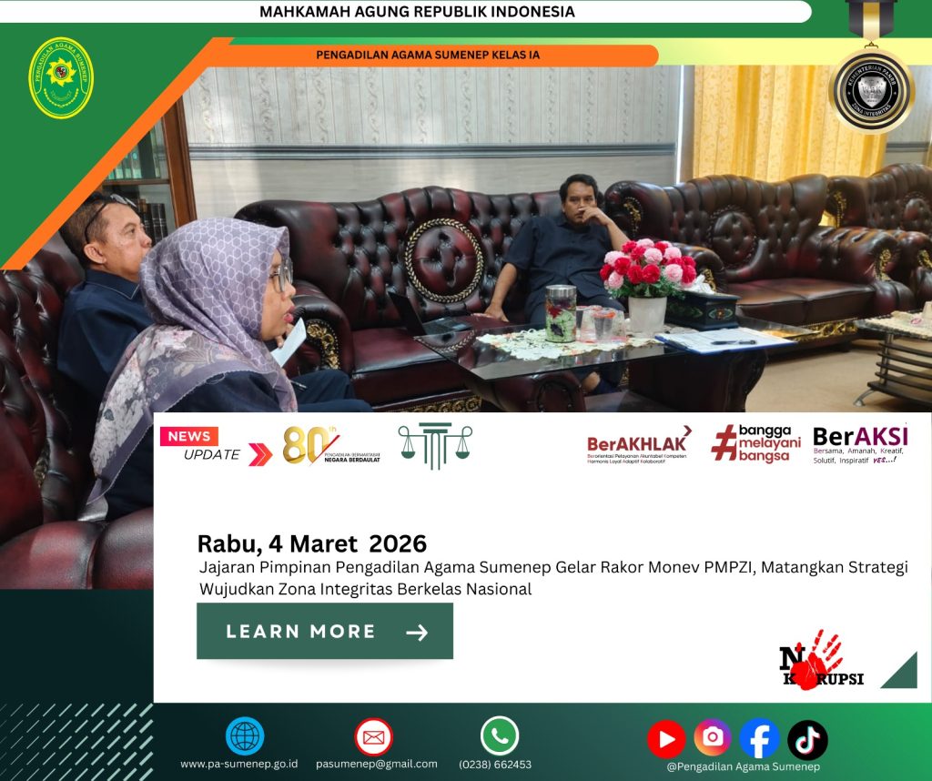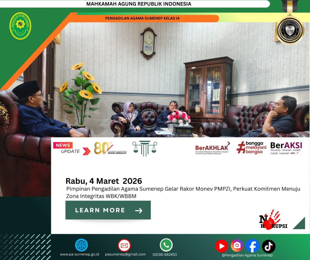 pa-sumenep.go.id – Jajaran pimpinan Pengadilan Agama Sumenep menggelar Rapat Koordinasi Monitoring dan Evaluasi PMPZI pada Rabu, 4 Maret 2026. Kegiatan strategis ini dilaksanakan di Ruang Ketua Pengadilan Agama Sumenep dengan penuh keseriusan dan semangat perubahan. Rakor tersebut menjadi langkah konkret dalam mematangkan strategi mewujudkan Zona Integritas berkelas nasional.