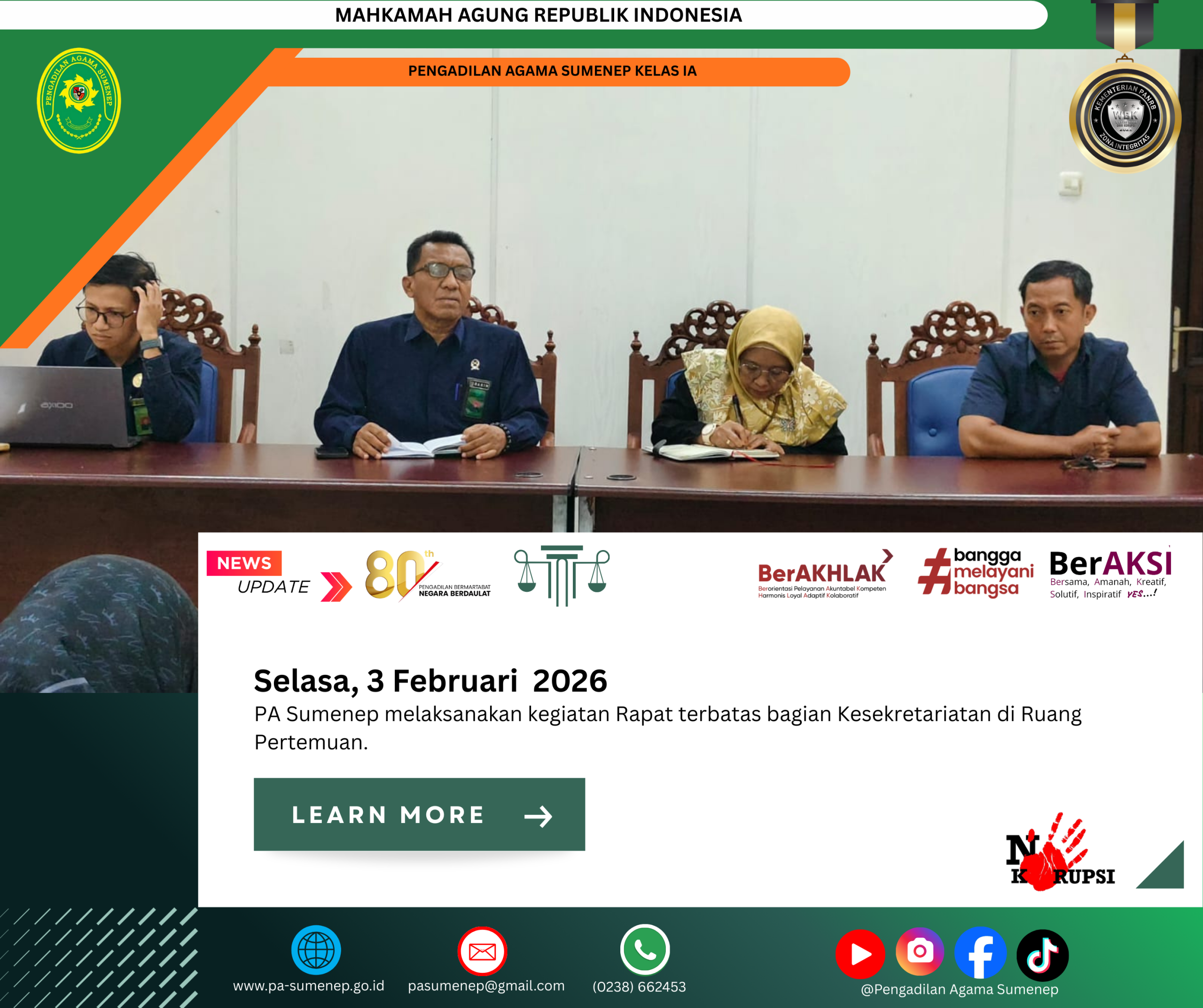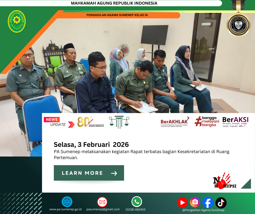pa-sumenep.go.id– Pengadilan Agama (PA) Sumenep melaksanakan kegiatan Rapat Terbatas Bagian Kesekretariatan sebagai upaya meningkatkan efektivitas kinerja dan koordinasi internal pada Selasa, 3 Februari 2026. Kegiatan ini berlangsung dalam suasana tertib dan penuh keterbukaan. Rapat difokuskan pada evaluasi pelaksanaan tugas administrasi sehari-hari.