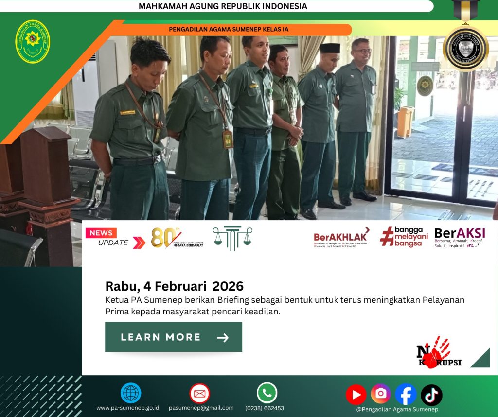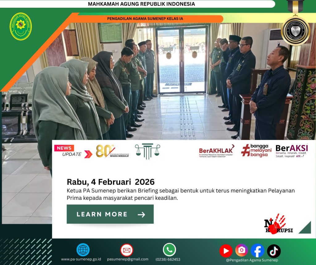pa-sumenep.go.id — Ketua Pengadilan Agama (PA) Sumenep memberikan briefing kepada seluruh aparatur pengadilan dengan menekankan pentingnya peningkatan pelayanan prima kepada masyarakat pencari keadilan pada hari ini Rabu 4 Februari 2026 di Ruang Tunggu. Dalam arahannya, Ketua PA Sumenep mengajak seluruh jajaran untuk terus memberikan service yang ramah, cepat, dan memuaskan sebagai bentuk komitmen terhadap pelayanan publik yang berkualitas.
