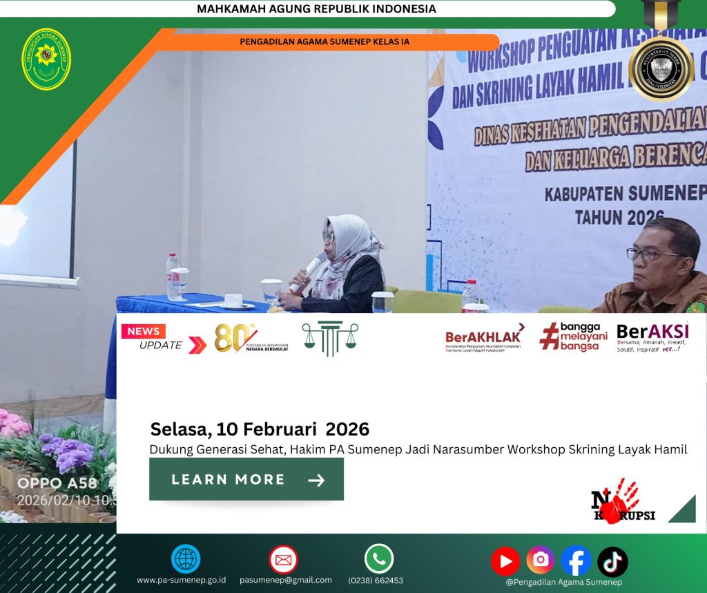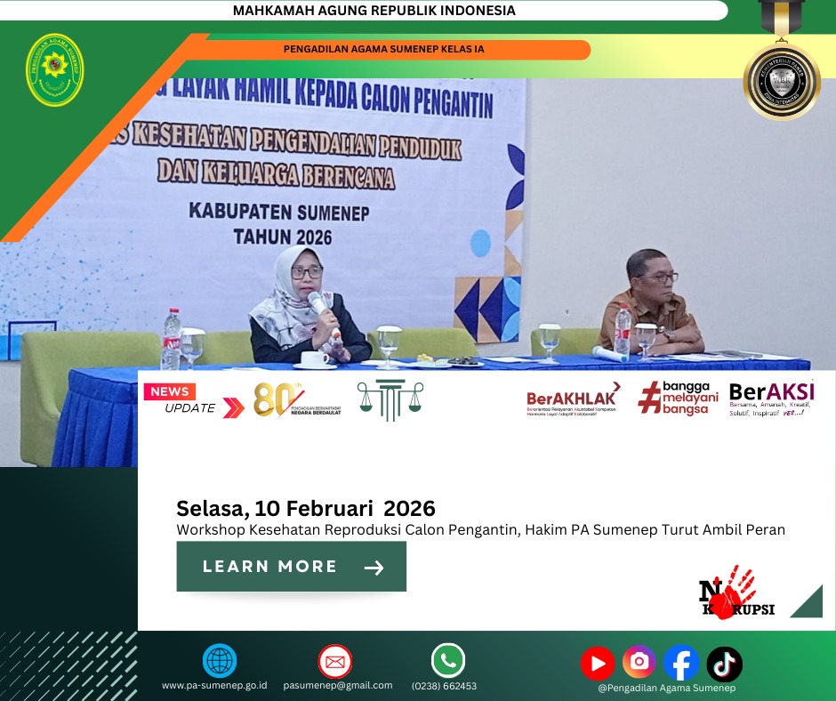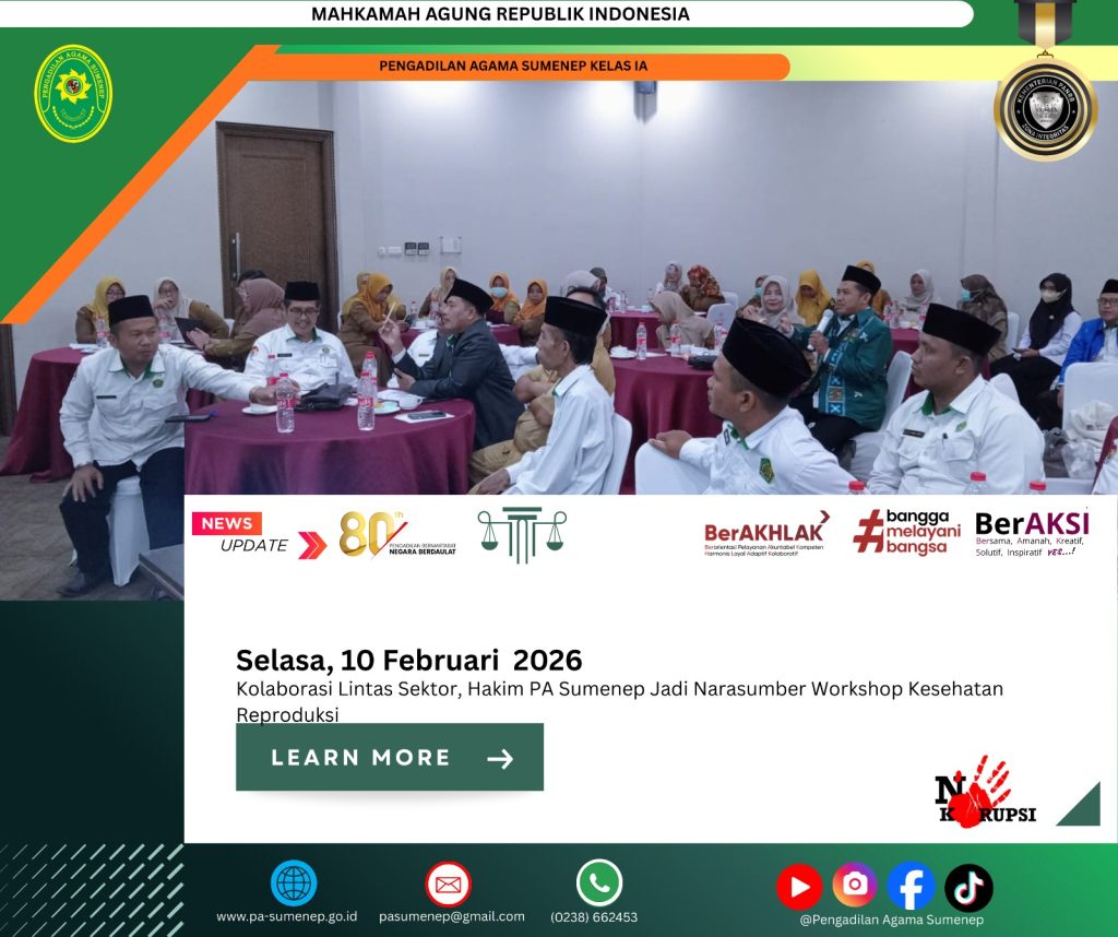 pa-sumenep.go.id – Kolaborasi lintas sektor menjadi sorotan utama dalam Workshop Kesehatan Reproduksi yang digelar di Ballroom Hotel De Bagraf Sumenep, Selasa, 10 Februari 2026. Kegiatan ini menghadirkan Hakim Pengadilan Agama Sumenep, Dra. Farhanah, M.H., sebagai narasumber kunci yang membahas peran hukum, kesehatan, dan pendidikan secara terpadu. Acara tersebut mempertemukan unsur peradilan, tenaga kesehatan, pendidik, dan komunitas untuk membangun kesadaran bersama.