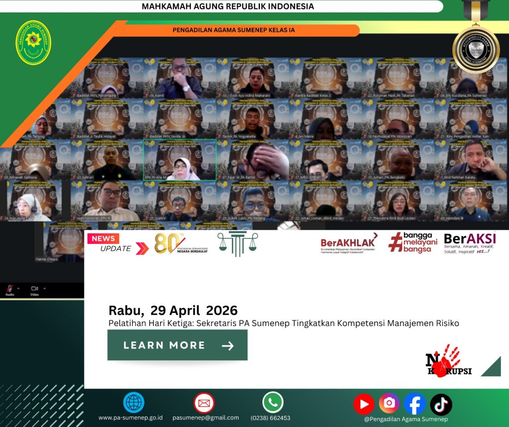 pa-sumenep.go.id – Pelatihan peningkatan kompetensi manajemen risiko yang diselenggarakan oleh Badan Pemeriksa Keuangan Republik Indonesia (BPK RI) bagi seluruh sekretaris di lingkungan Mahkamah Agung Republik Indonesia memasuki hari ketiga pada Rabu, 29 April 2026. Kegiatan ini dilaksanakan secara distance learning dan diikuti oleh para sekretaris dari berbagai satuan kerja peradilan di Indonesia, termasuk Sekretaris Pengadilan Agama (PA) Sumenep. Pelatihan ini bertujuan untuk memperkuat kapasitas aparatur dalam mengelola risiko secara sistematis guna mendukung tata kelola peradilan yang akuntabel dan transparan.