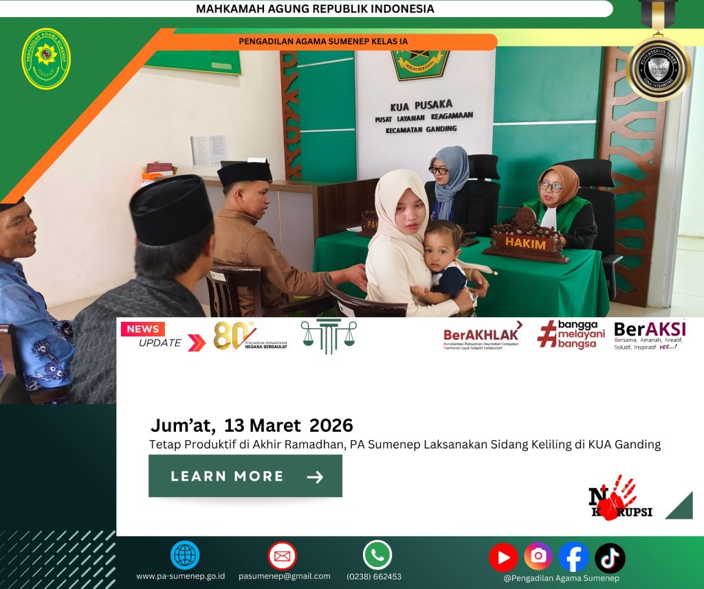 pa-sumenep.go.id – Sidang keliling yang digelar oleh Pengadilan Agama (PA) Sumenep di KUA Kecamatan Ganding pada Jumat, 13 Maret 2026, menjadi kabar menggembirakan bagi masyarakat di penghujung Ramadhan. Program ini dilaksanakan sebagai upaya mendekatkan layanan hukum kepada masyarakat tanpa harus datang jauh ke kantor pengadilan. “Kami ingin memastikan masyarakat tetap mendapatkan pelayanan hukum yang mudah, cepat, dan manusiawi,” ujar salah satu petugas sidang keliling.