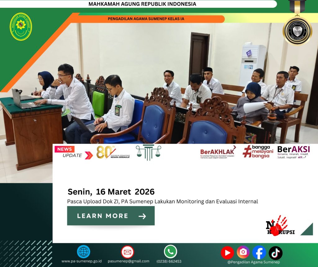 pa-sumenep.go.id – Pengadilan Agama Sumenep menggelar kegiatan monitoring dan evaluasi (monev) pasca upload dokumen pembangunan Zona Integritas pada Senin, 16 Maret 2026 di ruang pertemuan kantor. Kegiatan ini menjadi langkah penting dalam memastikan seluruh dokumen yang telah diunggah benar-benar memenuhi standar kualitas yang ditetapkan. Suasana kegiatan berlangsung penuh semangat karena seluruh tim berkomitmen kuat mewujudkan tata kelola lembaga yang bersih dan profesional.