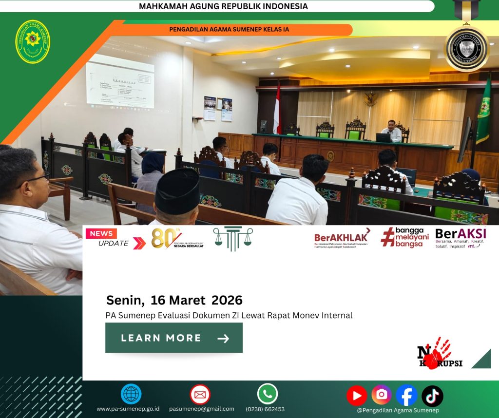 Kegiatan monev ini diharapkan menjadi momentum penguatan komitmen seluruh aparatur dalam mewujudkan Zona Integritas yang berkualitas di Pengadilan Agama Sumenep. Dengan evaluasi yang berkelanjutan, setiap langkah perbaikan dapat dilakukan secara terarah dan terukur. Semangat yang terus digaungkan dalam kegiatan tersebut adalah bahwa perubahan besar selalu dimulai dari langkah kecil yang dilakukan secara konsisten dan penuh integritas. (Tim Medsos)