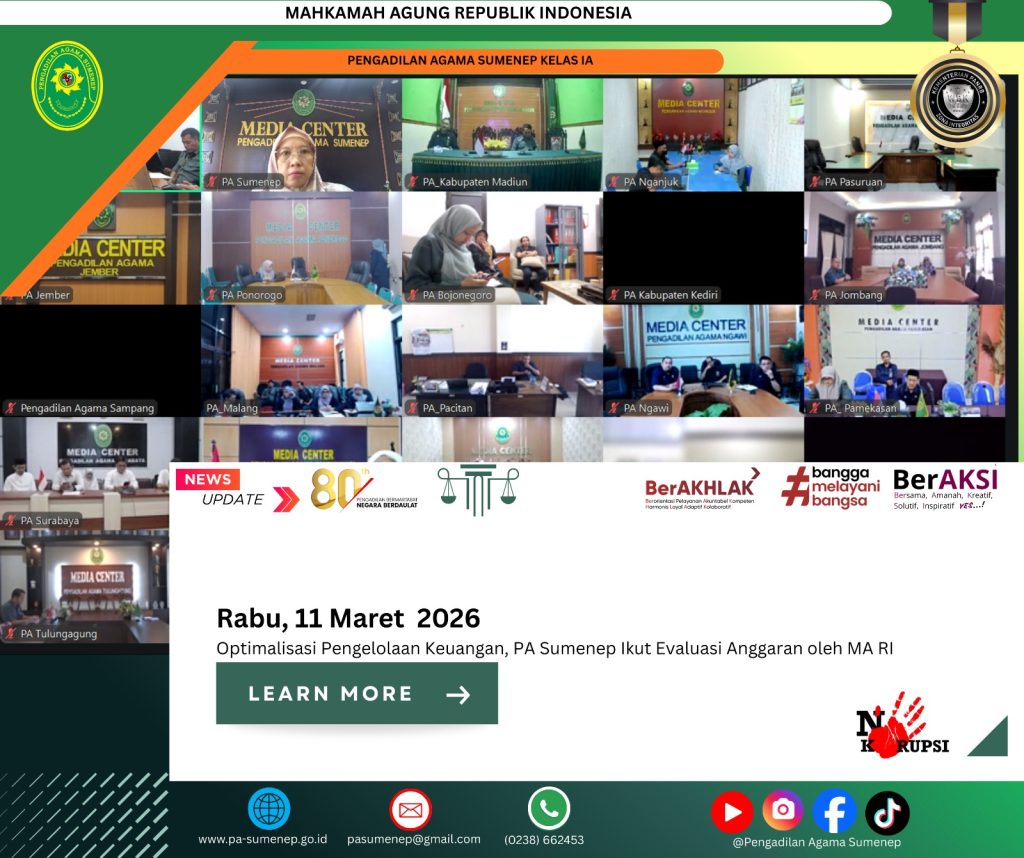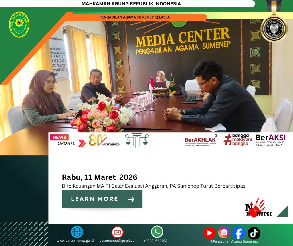 pa-sumenep.go.id – Pengadilan Agama Sumenep mengikuti Evaluasi Anggaran yang diselenggarakan oleh Mahkamah Agung Republik Indonesia pada Rabu, 11 Maret 2026. Kegiatan ini dilakukan secara daring di Media Center PA Sumenep untuk memastikan seluruh pegawai dapat berpartisipasi secara optimal. “Evaluasi anggaran merupakan sarana penting untuk meningkatkan transparansi dan efisiensi pengelolaan keuangan,” ujar Kepala PA Sumenep.