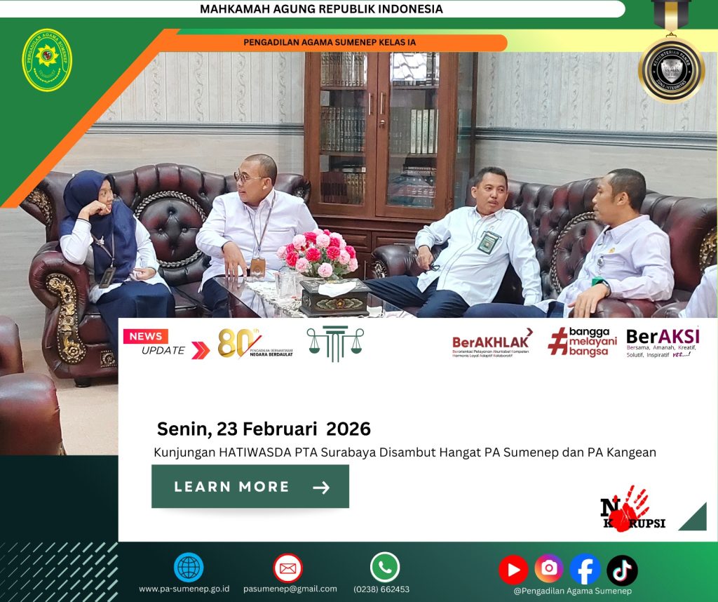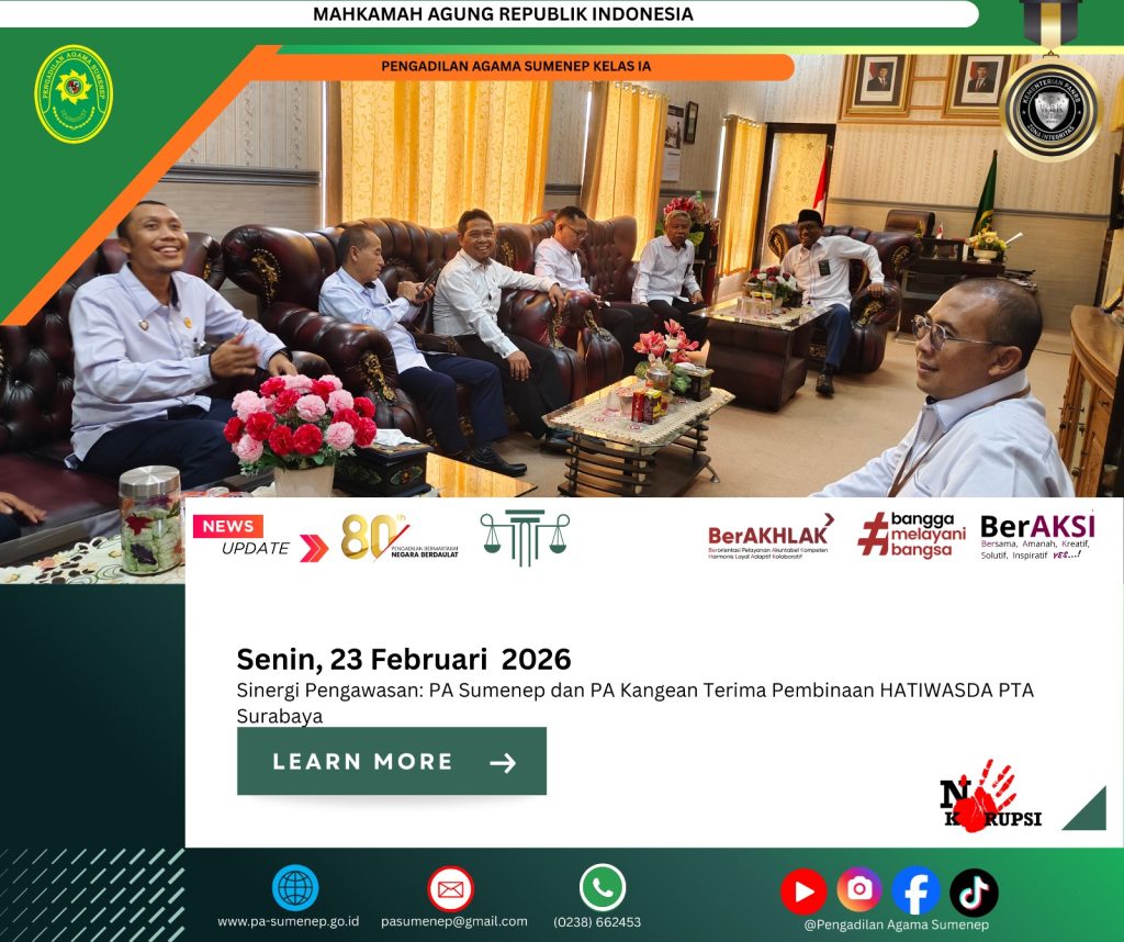 pa-sumenep.go.id – Pada Senin, 23 Februari 2026, PA Sumenep dan PA Kangean menyambut kunjungan HATIWASDA dari PTA Surabaya dengan penuh semangat dan komitmen. Kunjungan ini menjadi momentum strategis dalam memperkuat integritas serta sistem pengawasan internal di lingkungan peradilan agama. Suasana hangat dan penuh kekeluargaan mencerminkan tekad bersama untuk terus meningkatkan kualitas tata kelola lembaga.