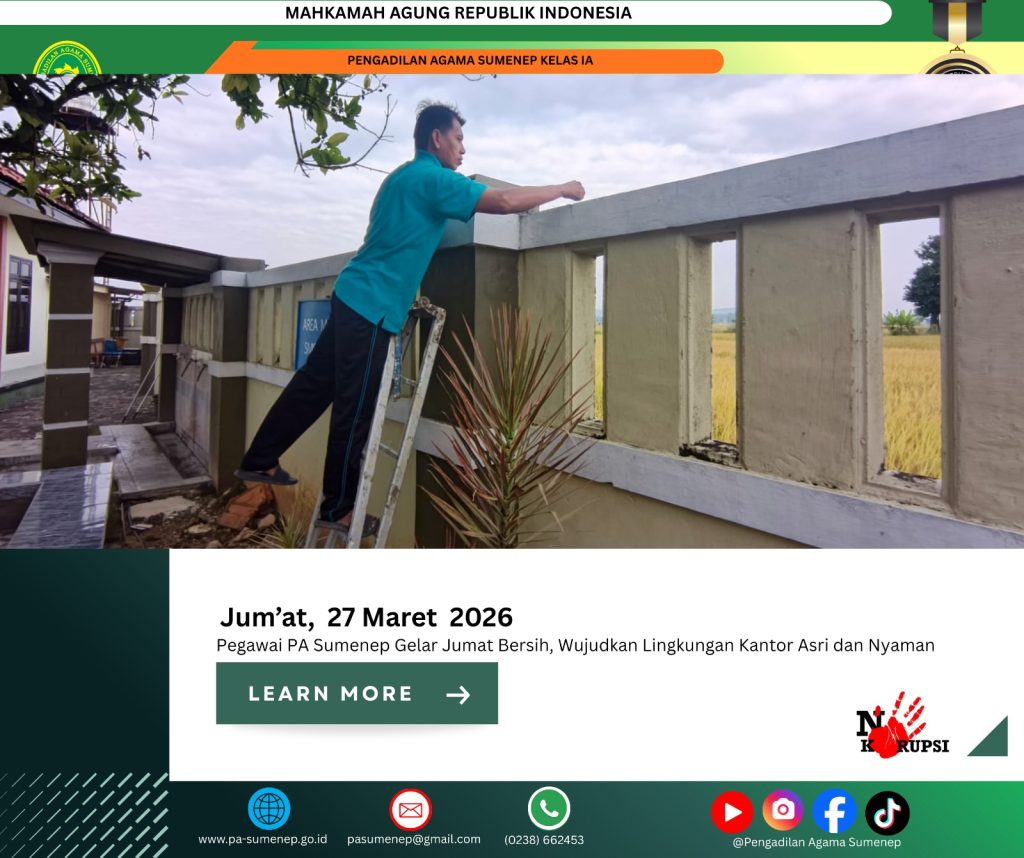 pa-sumenep.go.id – Pengadilan Agama Sumenep kembali menunjukkan komitmennya terhadap kebersihan lingkungan dengan menggelar kegiatan “Jum’at Bersih” pada Jum’at, 27 Maret 2026. Kegiatan ini melibatkan seluruh pegawai yang dengan penuh semangat membersihkan area kantor secara bersama-sama. Suasana kebersamaan terasa hangat, mencerminkan kepedulian terhadap lingkungan kerja yang lebih sehat dan nyaman.