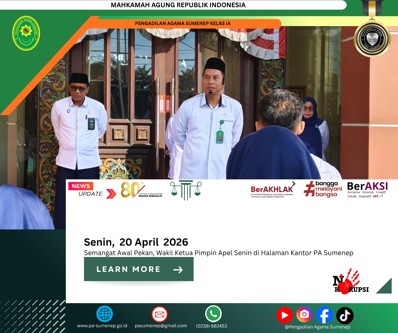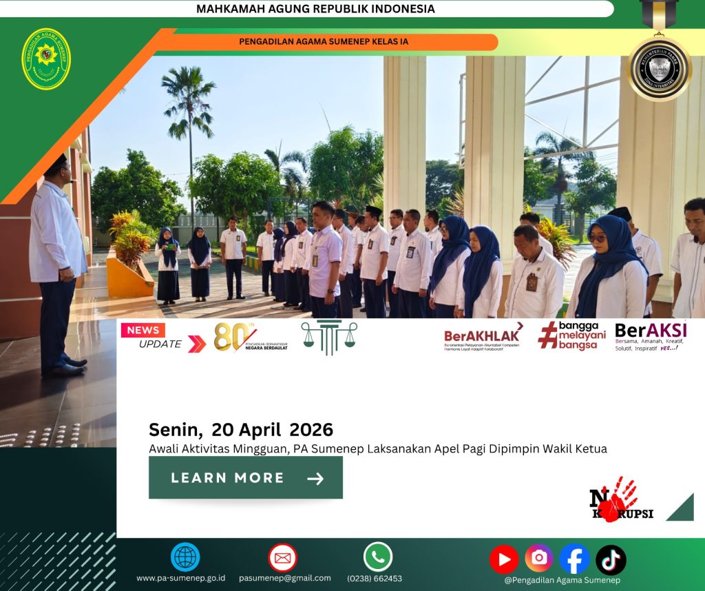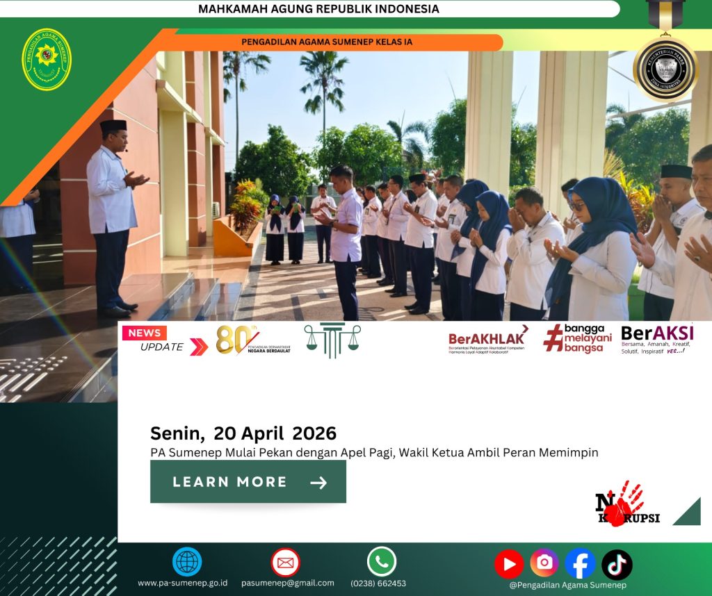 pa-sumenep.go.id – Pengadilan Agama Sumenep mengawali pekan dengan kegiatan apel pagi yang berlangsung pada Senin 20 April 2026, di halaman kantor PA Sumenep. Kegiatan ini dipimpin langsung oleh Wakil Ketua PA Sumenep, yang mengambil peran sebagai pembina apel. Apel pagi tersebut diikuti oleh seluruh aparatur, mulai dari hakim, pejabat struktural, hingga staf, sebagai bentuk disiplin dan komitmen dalam meningkatkan kinerja lembaga. Momentum ini dimanfaatkan untuk menyampaikan arahan penting terkait peningkatan pelayanan kepada masyarakat pencari keadilan.
