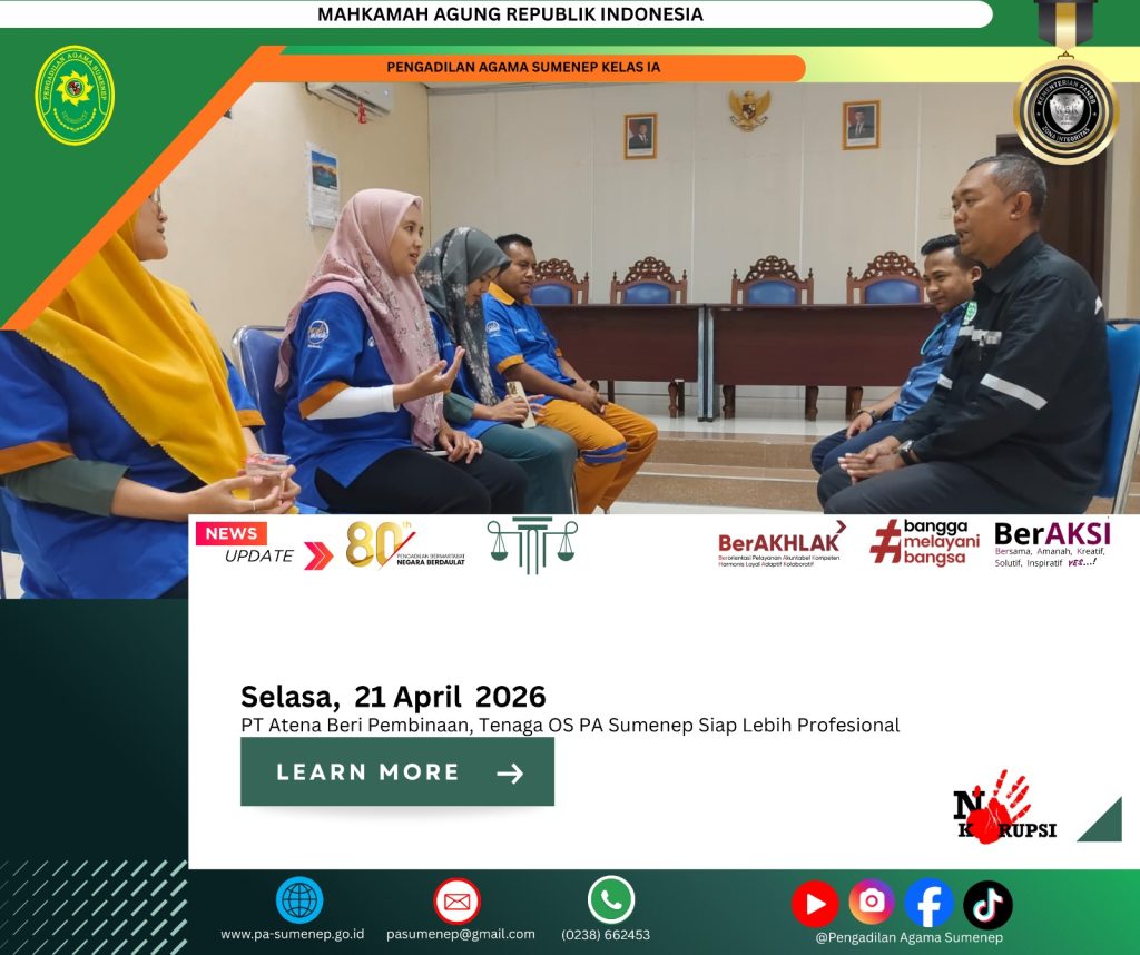 pa-sumenep.go.id – Pembinaan dan pelatihan intensif bagi tenaga OS PA Sumenep resmi digelar pada Selasa, 21 April 2026, sebagai upaya meningkatkan kompetensi dan profesionalisme kerja. Kegiatan ini berlangsung di lingkungan kantor Pengadilan Agama Sumenep dengan melibatkan tim ahli dari PT Athena Tagaya sebagai pelatih utama. Program ini diikuti oleh seluruh tenaga outsourcing (OS) yang bertugas dalam mendukung operasional pelayanan publik.