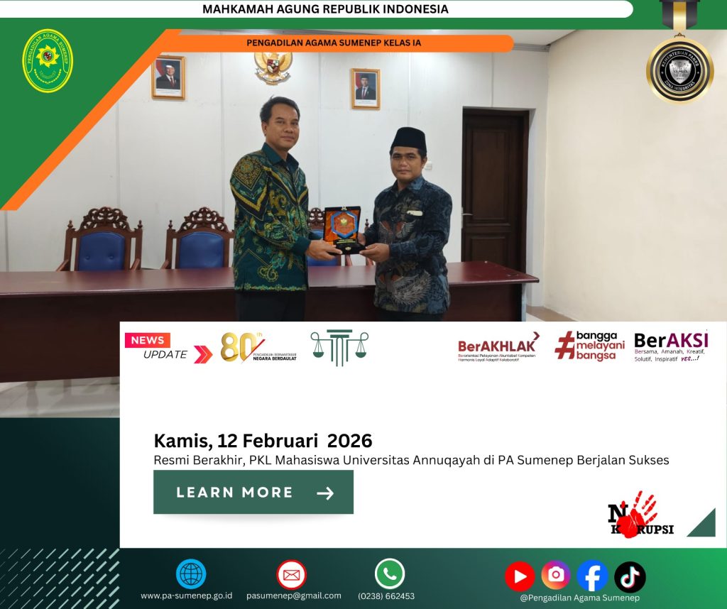 pa-sumenep.go.id – Program Praktik Kerja Lapangan (PKL) Mahasiswa Universitas Annuqayah Guluk-Guluk Sumenep resmi berakhir pada Kamis, 12 Februari 2026. Kegiatan yang berlangsung selama beberapa bulan ini ditutup dengan suasana haru dan penuh kebanggaan. Seluruh peserta dinyatakan berhasil menyelesaikan tugas dan tanggung jawabnya dengan baik.