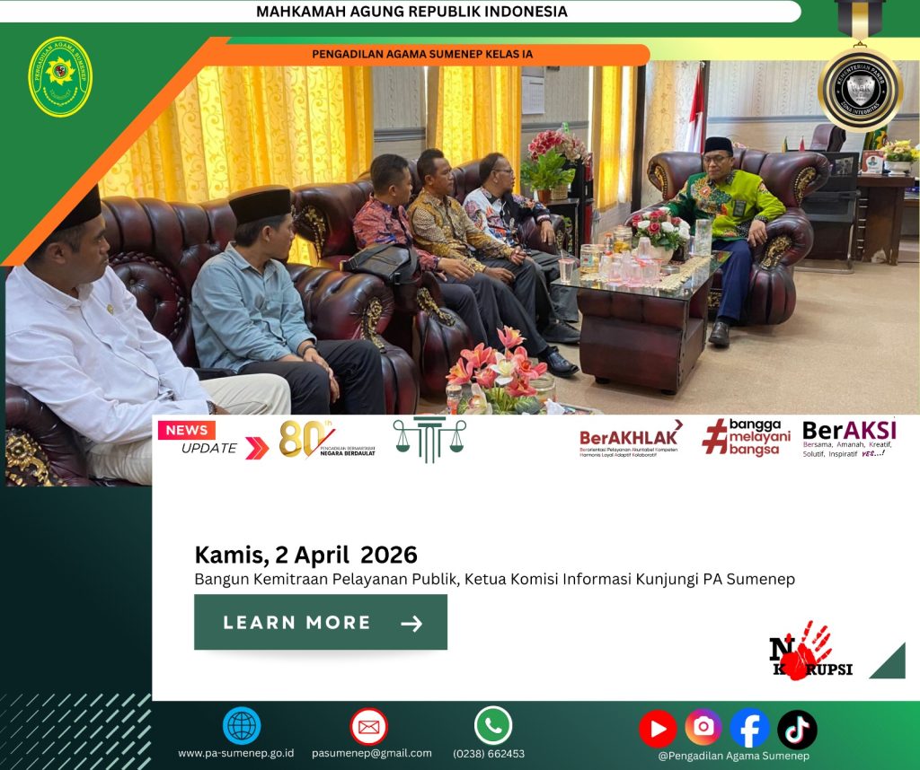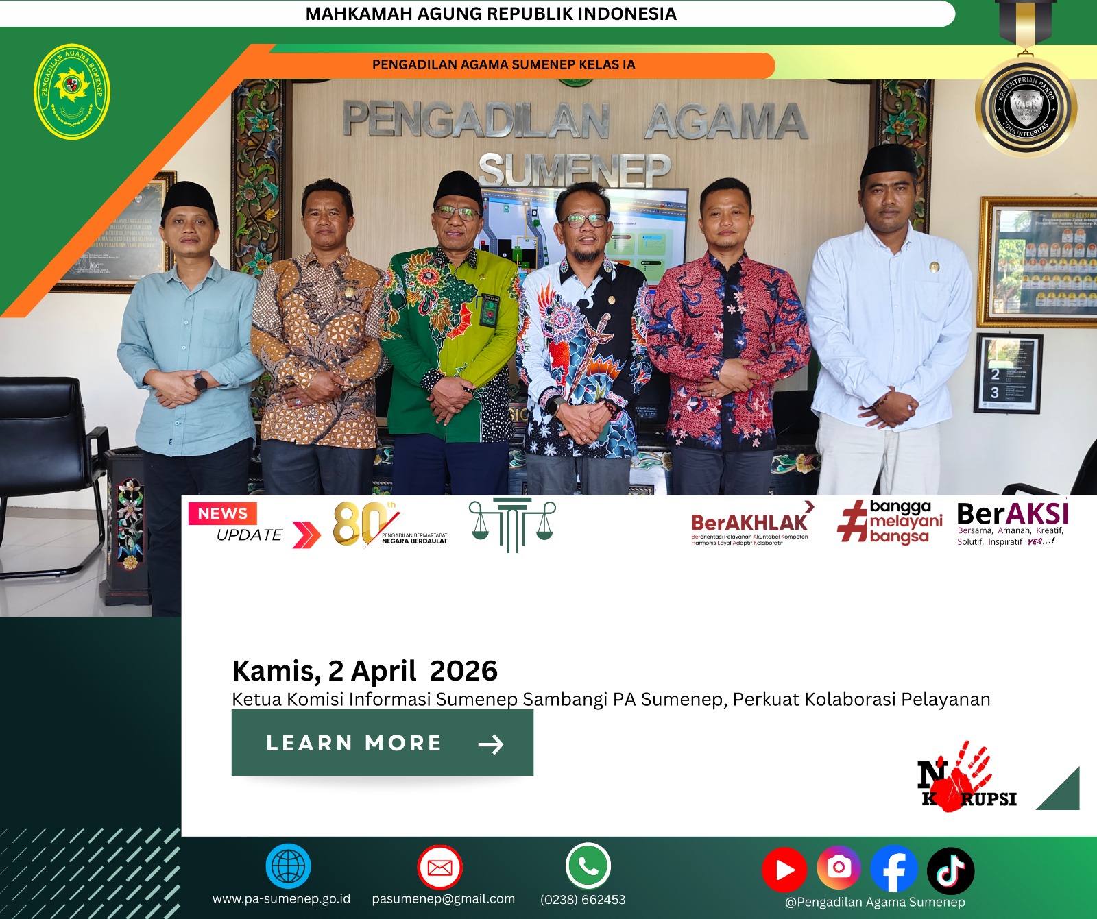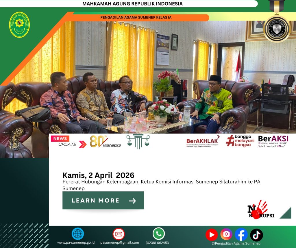 pa-sumenep.go.id – Suasana hangat penuh keakraban terasa di Pengadilan Agama Sumenep saat Ketua Komisi Informasi Kabupaten Sumenep bersama jajarannya melakukan kunjungan silaturahmi pada Kamis, 2 April 2026. Kedatangan rombongan disambut langsung oleh Ketua Pengadilan Agama Sumenep, Moh. Jatim, S.Ag., M.H.I., di ruang kerjanya dengan penuh rasa hormat dan keterbukaan. “Silaturahmi adalah jembatan yang menguatkan sinergi dan kepercayaan antar lembaga,” menjadi kutipan yang menggambarkan makna pertemuan tersebut.