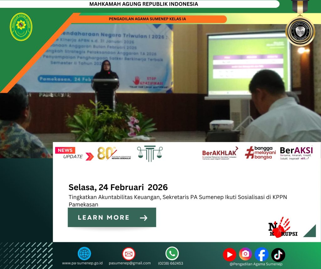 Partisipasi aktif dalam sosialisasi ini menjadi bukti nyata bahwa peningkatan kompetensi aparatur adalah kunci terciptanya tata kelola yang profesional. “Mari kita jadikan setiap rupiah yang dikelola sebagai amanah yang dipertanggungjawabkan dengan sebaik-baiknya,” ujar salah satu narasumber memotivasi peserta. Melalui kolaborasi dan komitmen yang kuat, PA Sumenep optimistis mampu terus meningkatkan akuntabilitas serta memberikan pelayanan terbaik bagi masyarakat dan negara. (Tim Medsos)