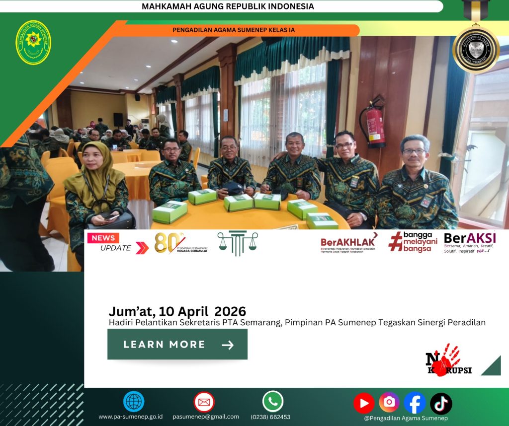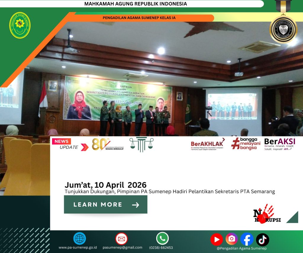pa-sumenep.go.id – Pimpinan Pengadilan Agama (PA) Sumenep menghadiri acara pengambilan sumpah jabatan dan pelantikan Dr. Naffi, S.Ag., M.H. sebagai Sekretaris Pengadilan Tinggi Agama (PTA) Semarang pada Kamis, 9 April 2026. Kegiatan tersebut berlangsung khidmat di Aula Pengadilan Tinggi Agama Semarang dengan dihadiri berbagai unsur pimpinan peradilan agama. Kehadiran pimpinan PA Sumenep menjadi bentuk dukungan dan penghormatan atas amanah baru yang diemban oleh Dr. Naffi.
