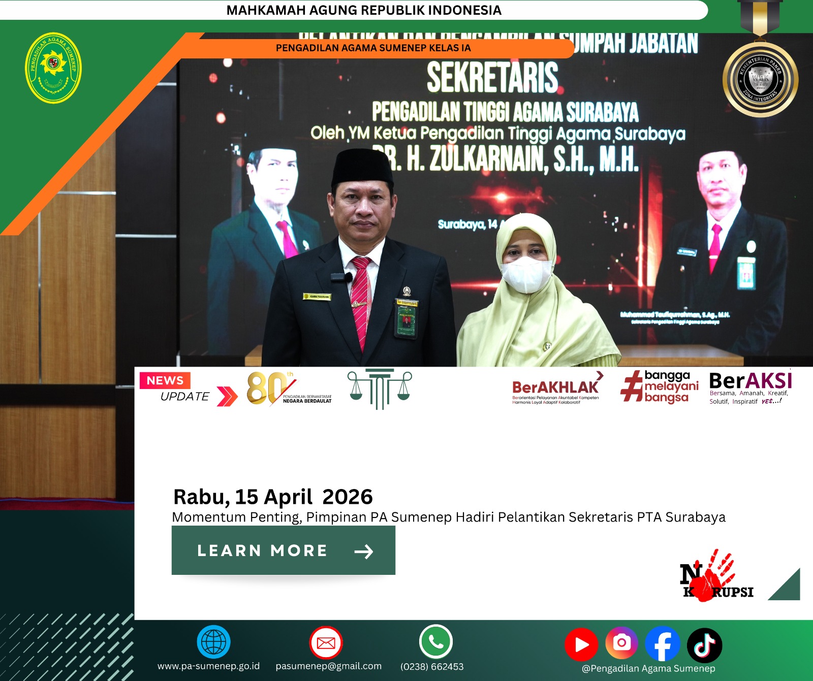 pa-sumenep.go.id – Jajaran pimpinan Pengadilan Agama Sumenep menghadiri acara pengambilan sumpah jabatan dan pelantikan Muhammad Taufiqurrahman sebagai Sekretaris di Pengadilan Tinggi Agama Surabaya pada Selasa, 14 April 2026. Kegiatan yang berlangsung di kantor PTA Surabaya ini menjadi momen penting dalam penguatan struktur organisasi peradilan agama di wilayah Jawa Timur. Kehadiran para pimpinan PA Sumenep menunjukkan komitmen dalam mendukung setiap proses pengembangan kelembagaan dan peningkatan kualitas pelayanan publik.