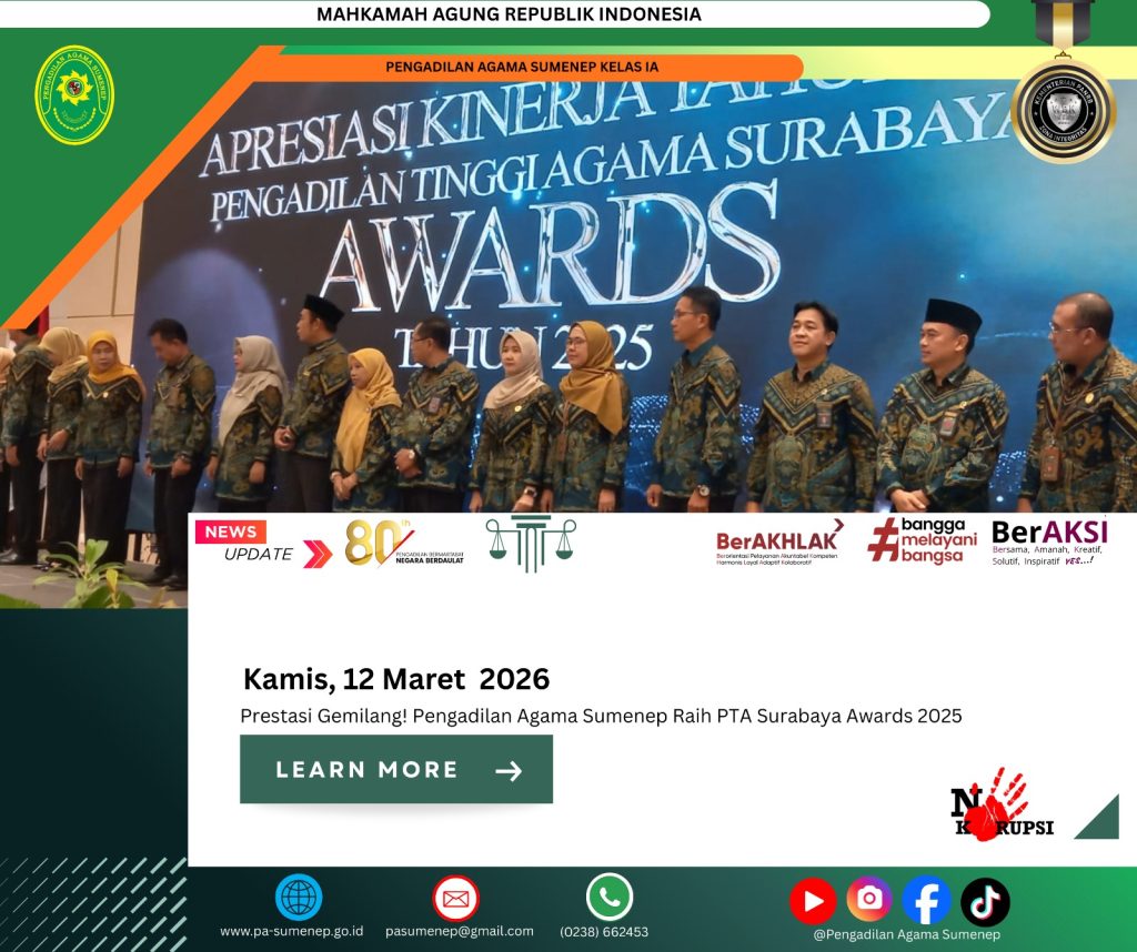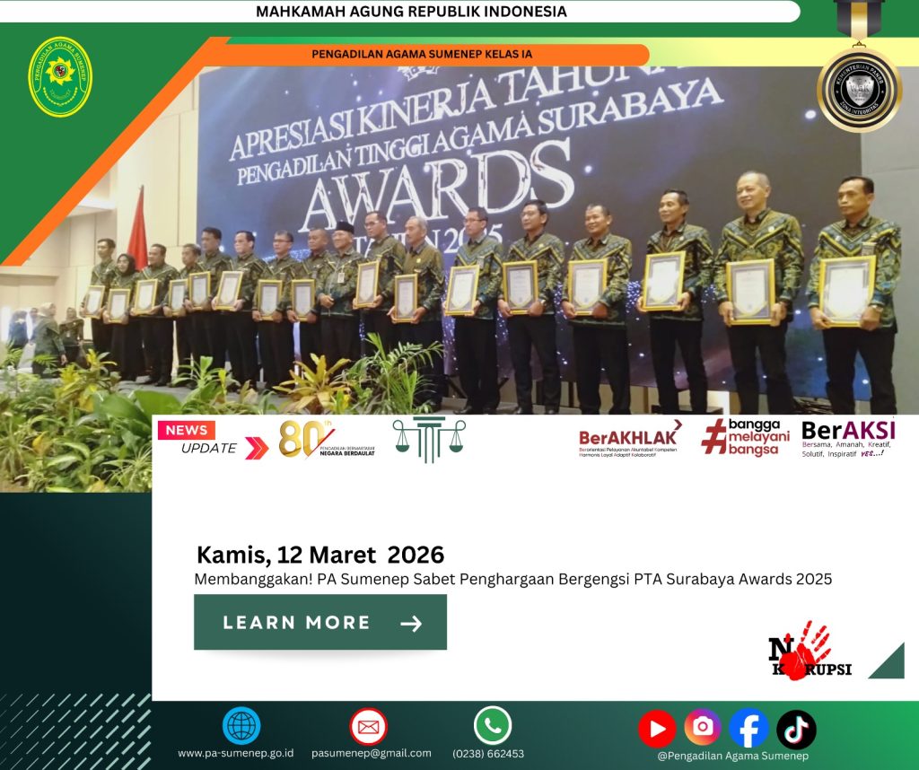 Raihan PTA Surabaya Awards 2025 menjadi bukti bahwa komitmen, integritas, dan inovasi mampu membawa sebuah institusi menuju pencapaian yang membanggakan. Pengadilan Agama Sumenep diharapkan dapat terus mempertahankan kualitas kinerja serta menjadi teladan bagi satuan kerja lainnya. Sebagaimana pesan motivasi yang menggema dalam acara tersebut, “Kesuksesan bukanlah akhir perjalanan, melainkan awal dari tanggung jawab untuk terus menjadi lebih baik.” (Tim Medsos)