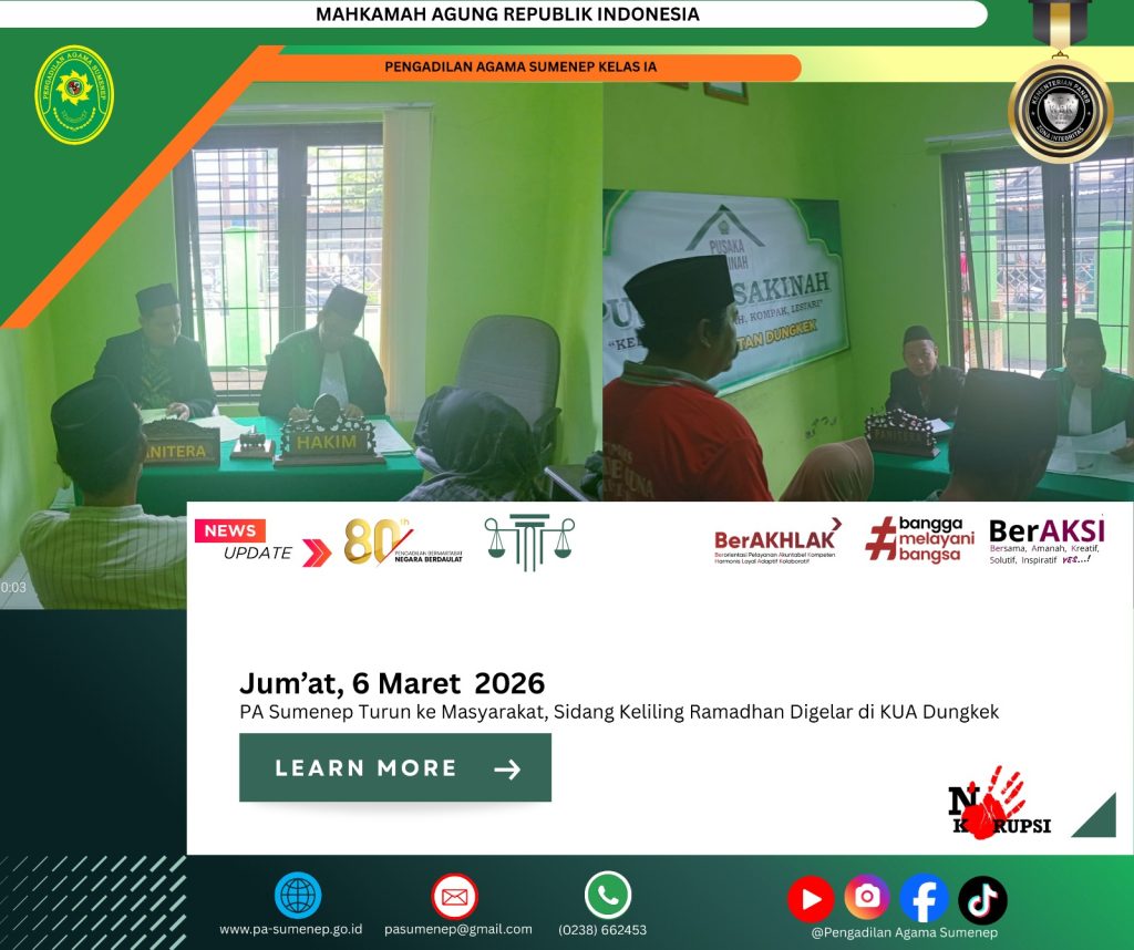 pa-sumenep.go.id – Suasana Ramadhan yang penuh berkah dimanfaatkan oleh Pengadilan Agama Sumenep dengan menghadirkan layanan sidang keliling bagi masyarakat di Kantor Urusan Agama (KUA) Kecamatan Dungkek. Program ini menjadi bentuk nyata pelayanan hukum yang mendekatkan keadilan kepada masyarakat tanpa harus menempuh perjalanan jauh ke kantor pengadilan. Langkah ini disambut hangat oleh warga yang merasa terbantu dengan kemudahan akses pelayanan tersebut.