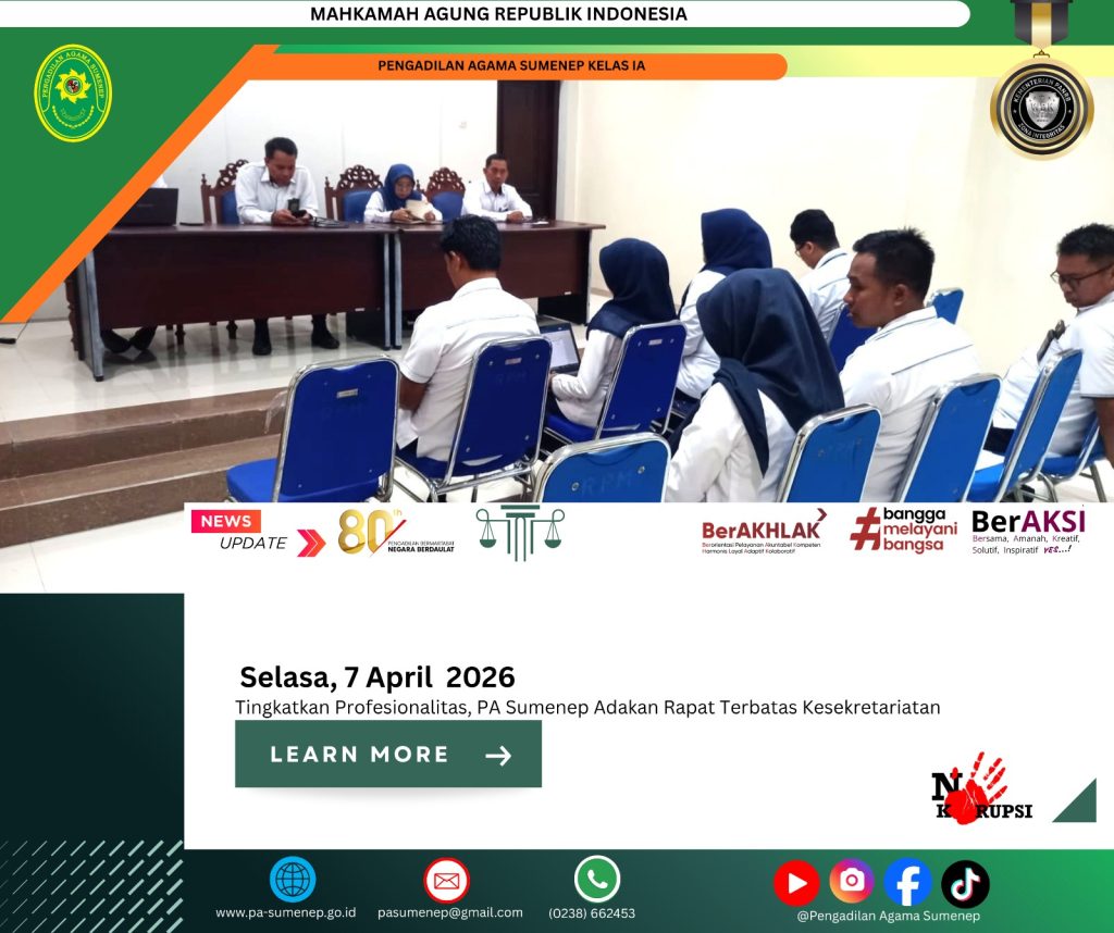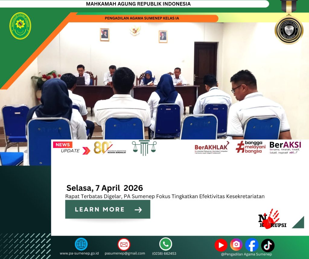 pa-sumenep.go.id – Pengadilan Agama Sumenep (PA Sumenep) menggelar rapat terbatas bagian kesekretariatan pada Senin, 6 April 2026, di ruang pertemuan kantor. Kegiatan ini dipimpin langsung oleh Wakil Ketua bersama Sekretaris sebagai upaya meningkatkan profesionalitas aparatur. Rapat tersebut dihadiri oleh seluruh jajaran kesekretariatan yang memiliki peran penting dalam mendukung kinerja lembaga.