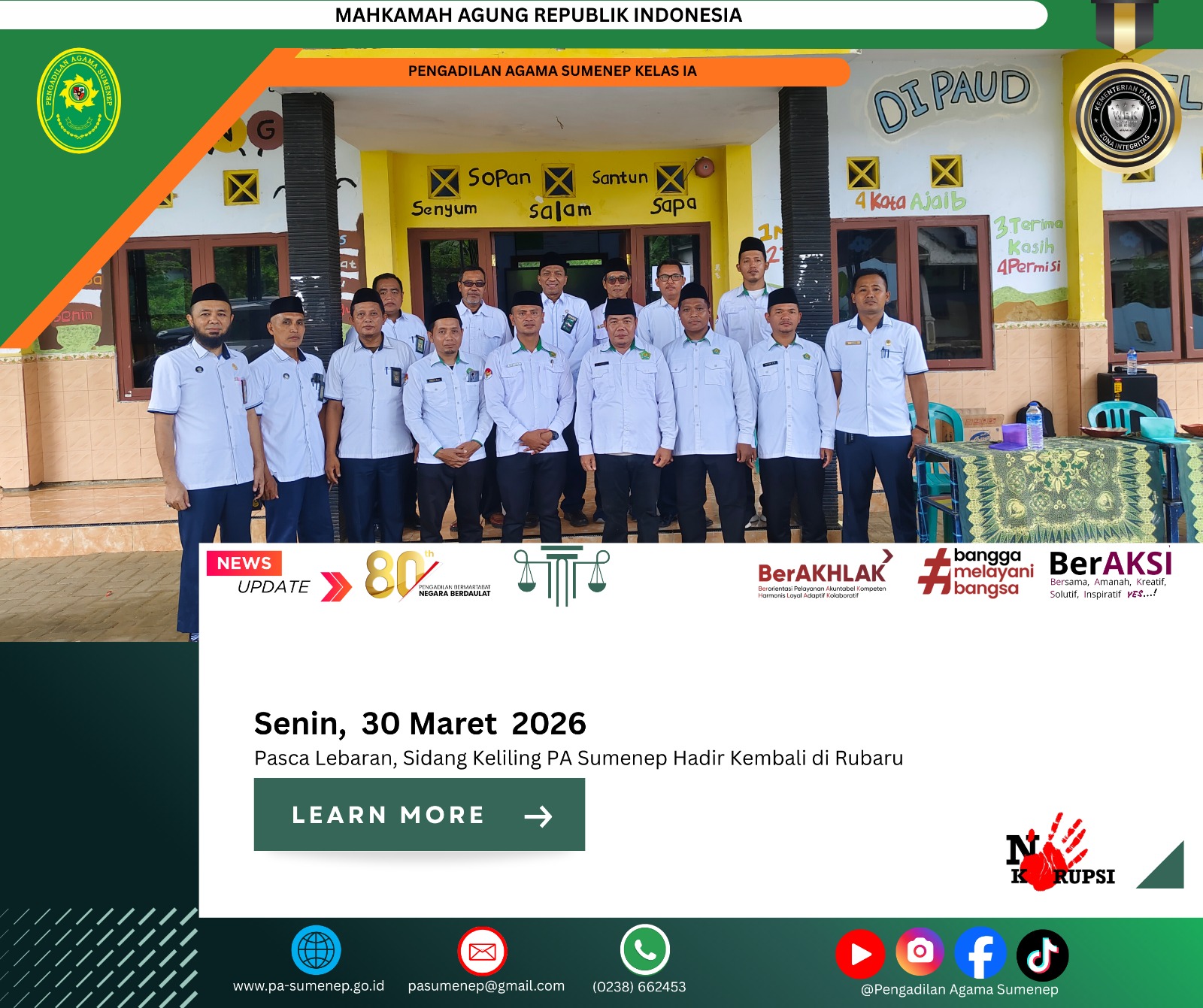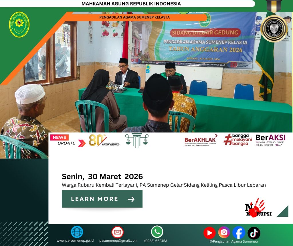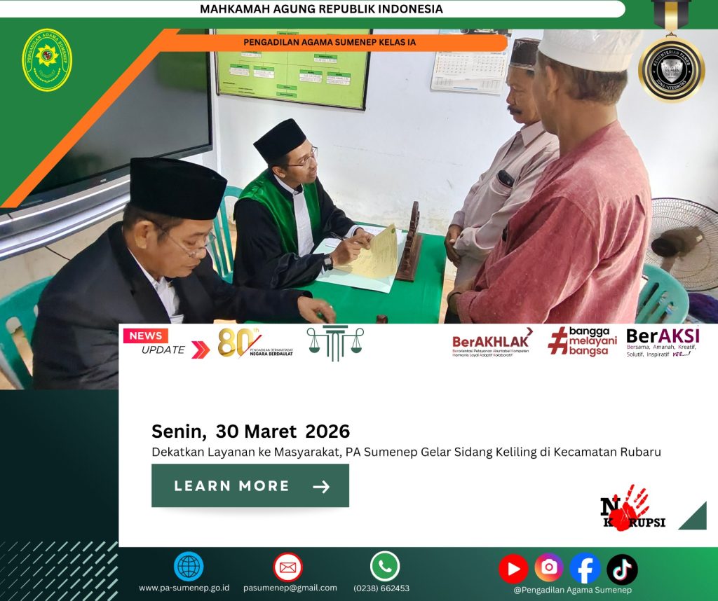 pa-sumenep.go.id – Pengadilan Agama (PA) Sumenep kembali menggelar sidang keliling di Yayasan Pendidikan Islam KH. A. Rasyidi, Desa Duko, Kecamatan Rubaru, pada Senin, 30 Maret 2026. Kegiatan ini menjadi bagian dari komitmen untuk mendekatkan layanan hukum kepada masyarakat, khususnya pasca Lebaran. Antusiasme warga terlihat tinggi sejak pagi hari, menunjukkan bahwa kebutuhan akan akses keadilan semakin disadari.